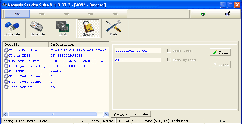 Press 'Read' in the Simlocks Page in the Security Menu